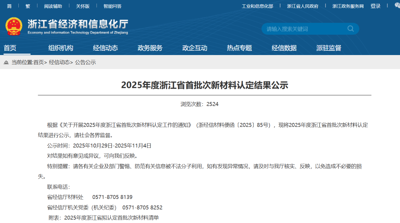 根據(jù)《關(guān)于開展2025年度浙江省首批次新材料認(rèn)定工作的通知》(浙經(jīng)信材料便函〔2025〕85號(hào)),現(xiàn)將2025年度浙江省首批次新材料認(rèn)定結(jié)果進(jìn)行公示,請社會(huì)各界監(jiān)督。
