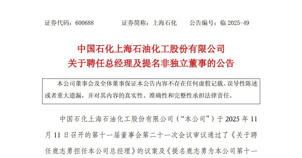 中國(guó)石化上海石油化工股份有限公司(下稱“本公司”)于2025年11月11日召開的第十一屆董事會(huì)第二十一次會(huì)議審議通過了《關(guān)于聘任鹿志勇?lián)伪竟究偨?jīng)理》的議案及《提名鹿志勇為本公司第十一屆董事會(huì)非獨(dú)立董事候選人》的議案。