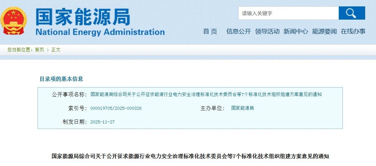 根據(jù)《能源標(biāo)準(zhǔn)化管理辦法及實施細(xì)則》《國家能源局關(guān)于進(jìn)一步完善能源行業(yè)標(biāo)準(zhǔn)化技術(shù)委員會管理的通知》,我局?jǐn)M批準(zhǔn)組建能源行業(yè)電力安全治理標(biāo)準(zhǔn)化技術(shù)委員會、能源行業(yè)電力溫室氣體排放管理標(biāo)準(zhǔn)化技術(shù)委員會、能源行業(yè)二氧化碳捕集運(yùn)輸利用與封存標(biāo)準(zhǔn)化技術(shù)委員會、能源行業(yè)氫能基礎(chǔ)與通用標(biāo)準(zhǔn)化技術(shù)委員會、能源行業(yè)氫能制取標(biāo)準(zhǔn)化技術(shù)委員會、能源行業(yè)氫能儲存與運(yùn)輸標(biāo)準(zhǔn)化技術(shù)委員會、能源行業(yè)氫能應(yīng)用標(biāo)準(zhǔn)化技術(shù)委員會?,F(xiàn)就以上標(biāo)準(zhǔn)化技術(shù)委員會的組建方案公開征求意見,征求意見截止時間為2025年12月28日,請以書面形式將意見通過電子郵件反饋至nb_standard@126.com。