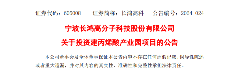 長(zhǎng)鴻高科投建丙烯酸產(chǎn)業(yè)園項(xiàng)目
