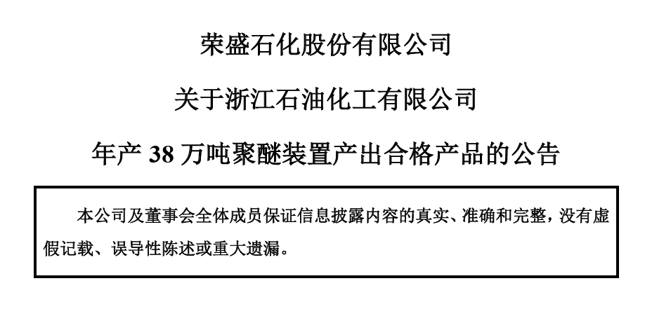 2023年4月,榮盛石化公告稱:控股子公司浙江石油化工有限公司在舟山綠色石化基地投資建設(shè)的38萬噸/年聚醚裝置中6萬噸/年P(guān)PG(聚醚多元醇)生產(chǎn)線已產(chǎn)出合格產(chǎn)品。